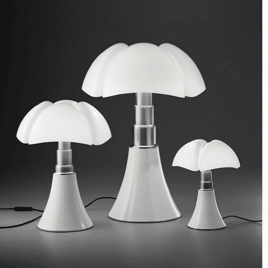 La lampe Pipistrello (ndlr. chauve-souris en italien), dessinée par Gae Aulenti en 1965 pour Martinelli Luce, séduit par son abat-jour ondulé en méthacrylate et son pied télescopique en métal. À mi-chemin entre lampe de table et lampadaire, elle incarne l’élégance modulable et le futurisme du design italien des années 60.