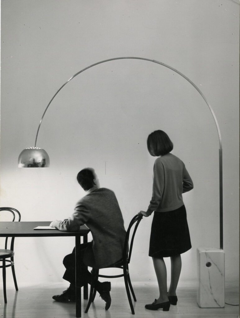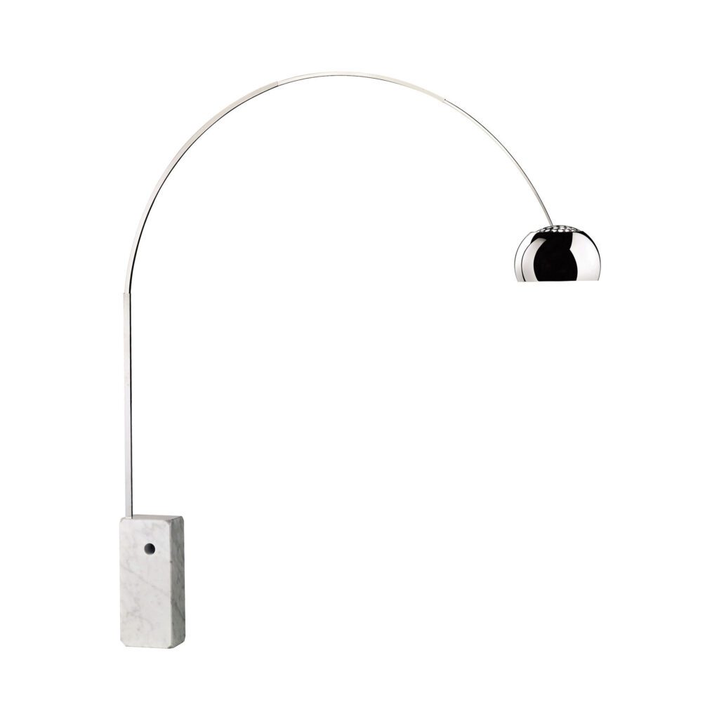La lampe Arco, imaginée par Achille et Pier Giacomo Castiglioni en 1962 pour Flos, est un chef-d’œuvre du modernisme italien. Elle associe une base en marbre de Carrare, un grand arc en acier inox et un abat-jour hémisphé- rique, permettant d’éclairer un espace sans support au sol. Elle symbolise le mariage parfait entre élégance sculpturale et rationalité fonctionnelle.