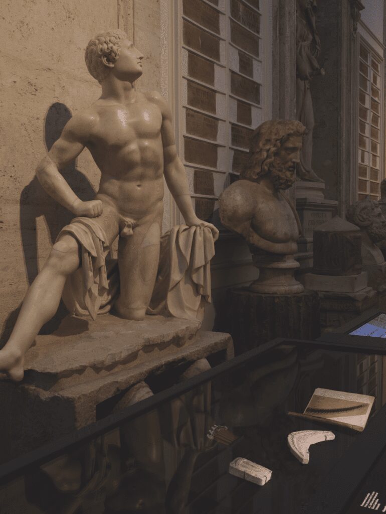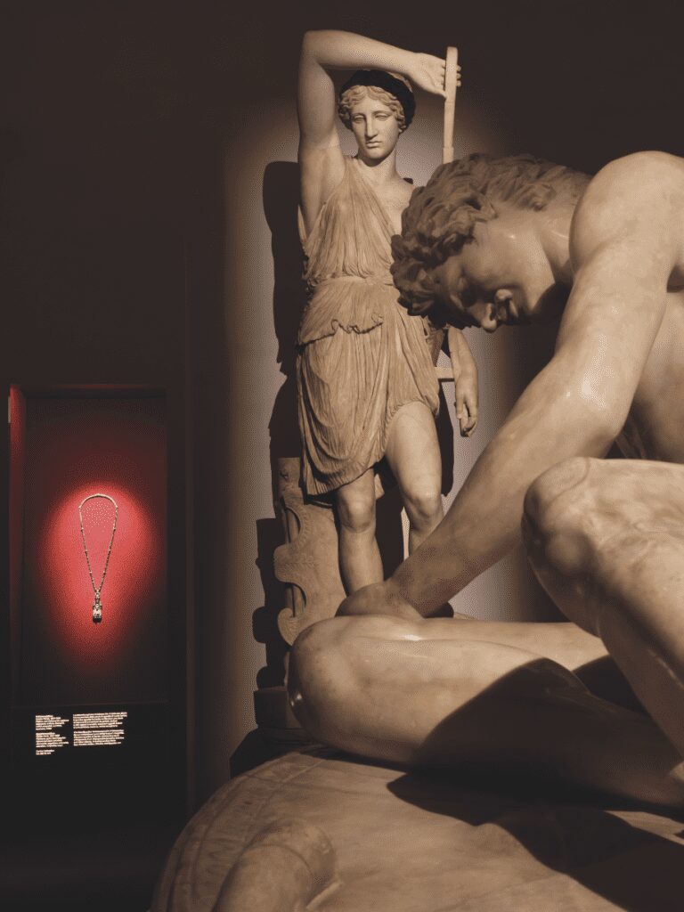 Fruit d’un important travail scientifique conduit par l’historienne Bianca Cappello, l’archéologue Stéphane Verger, ainsi que le surintendant du musée du Capitole, Claudio Parisi Presicce, Cartier e il Mito présente un opéra immersif dans lequel bijoux, montres et objets précieux dialoguent avec les sculptures et artefacts antiques issus des collections du Palazzo Nuovo et d’autres institutions italiennes. Organisée en deux volets, l’exposition s’ouvre sur les débuts de Cartier en 1847, qui ont vu naître les premiers designs d’inspiration gréco-romaine, et se poursuit avec un focus sur le début du 20e, époque durant laquelle l’Antiquité était à nouveau très en vogue dans les domaines de l’art, de la culture, de la mode et de la joaillerie. Ouverts en 1733, sous l’impulsion d’Alessandro Gregorio Capponi et du pape Clément XII Corsini, les Musées du Capitole regorgent de trésors, en particulier les statues de la collection du Cardinal Alessandro Albani. Datant de l’Antiquité, elles fournissent une toile de fond millénaire où figures mythiques et trésors joailliers se répondent avec une poésie inédite. Dans cet écrin aussi étroit que fragile, le défi fut de taille. C’est d’ailleurs « la première fois qu’une exposition Cartier prend place dans les galeries permanentes d’un musée. Avec Cartier e il Mito, le statut artistique des créations de la maison est pleinement réaffirmé » souligne Pascale Lepeu, directrice de la Collection Cartier.