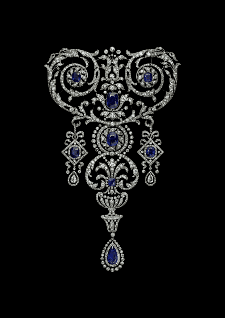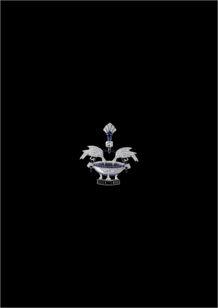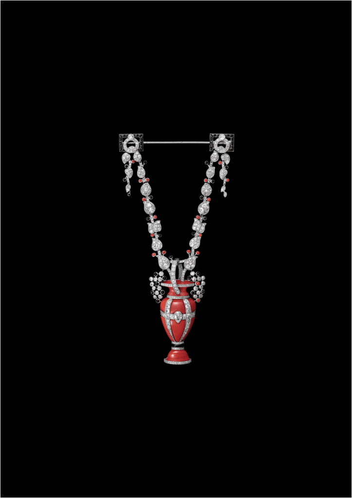 Joaillier des formes et des symboles, Cartier puise dans l’Antiquité une part essentielle de son vocabulaire esthétique. Temples, colonnes, obélisques, amphores, urnes, bassins, fresques ou encore frises géométriques sont transposées tantôt sur une broche, tantôt sur une tiare, une bague, ou un accessoire précieux. Le monde végétal irrigue lui aussi la création avec des feuilles de lierre, d’olivier, de laurier ou du raisin. Côté faune, le bestiaire de Cartier se révèle lui aussi être un héritage antique, à travers la figure mythique de la chimère, ou celle de la panthère, qui apparaît dès les années 1920 sur des bagues et des bracelets. En plus d’une importante utilisation de pierres plébiscitées dans l’Antiquité, comme le lapis lazuli, le corail et le porphyre rouge, Cartier réinterprète à l’époque certaines techniques, telles que le travail de la mosaïque et de l’or, à travers des médailles évoquant les pièces de monnaie, ou encore la gravure en creux (intaglios). Prisés par les cours européennes, les camées figurent également parmi les œuvres emblématiques du joaillier. On retrouve ainsi un camée qui aurait appartenu à Napoléon III, et qui représenterait Dionysos sous les traits de la comtesse de Castiglione, maîtresse de l’empereur. Une broche Cartier de 1899 figure également un profil casqué d’Athéna sur camée en acier, entouré d’un cadre en argent émaillé de motifs renaissance, symbolisant la vertu et à la cité.