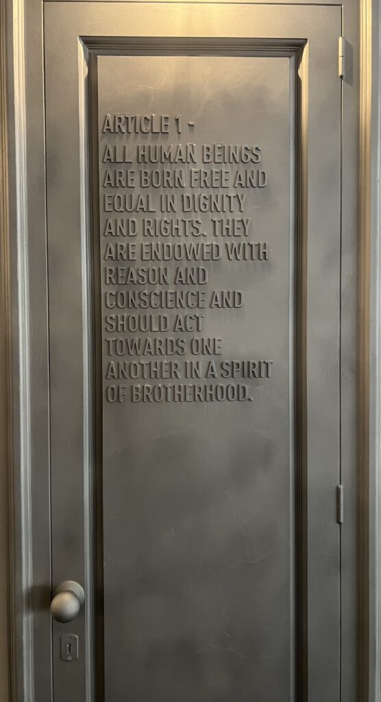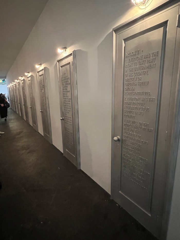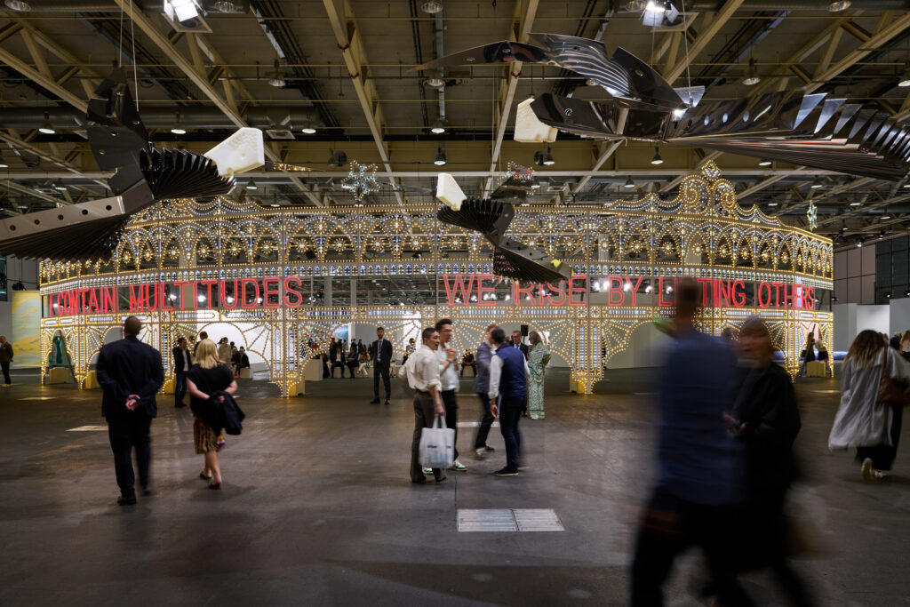 C’est donc ici que les directeurs de musées, de fondations et autres décideurs d’espaces urbains viennent étudier le marché. Ce sont des dispositifs qui demandent parfois de longues heures de montage tel We rise by lifting others de Marinella Senatore, ouvrant le bal à l’entrée de l’exposition. Ce sont des œuvres que l’on aborde dans l’espace, on les arpente, les contourne, tel le long couloir au 21 portes de Jaume Plensa, Forgotten dreams, où sur chaque porte figure un extrait de la Déclaration universelle des droits de l’Homme.