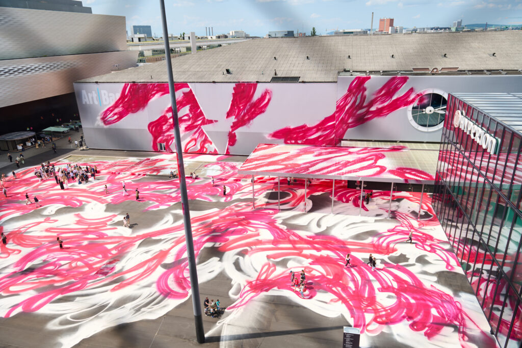 Cette année Art Basel a accueilli le public avec une oeuvreœuvre monumentale de Katharina Grosse, une installation majeure, qui transforme l’espace de la Messeplatz et les structures alentours en un gigantesque environnement chromatique rouge vif et blanc.