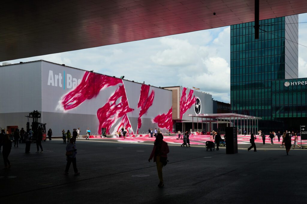 Cette année Art Basel a accueilli le public avec une oeuvreœuvre monumentale de Katharina Grosse, une installation majeure, qui transforme l’espace de la Messeplatz et les structures alentours en un gigantesque environnement chromatique rouge vif et blanc.