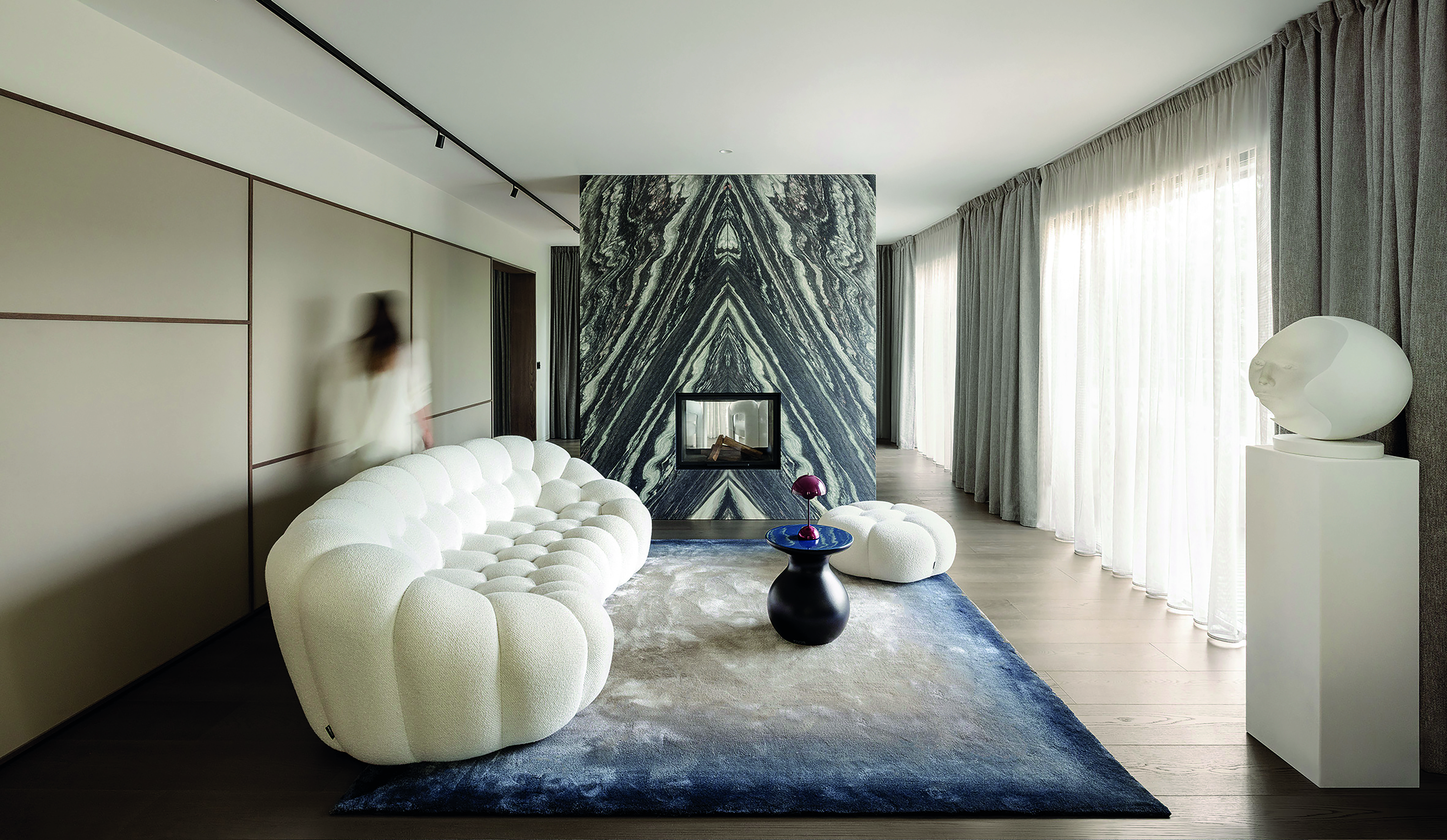 À Genève, la première réalisation du bureau d’architecte a été la rénova- tion d’une sublime villa à Cologny. Propulsant le studio sur le devant de la scène locale, ce projet offre un dialogue élégant entre bois et marbre, des espaces sobres avec du mobilier Roche Bobois, ainsi qu’un éclairage do- motique programmé selon différentes ambiances lumineuses souhaitées par le client.