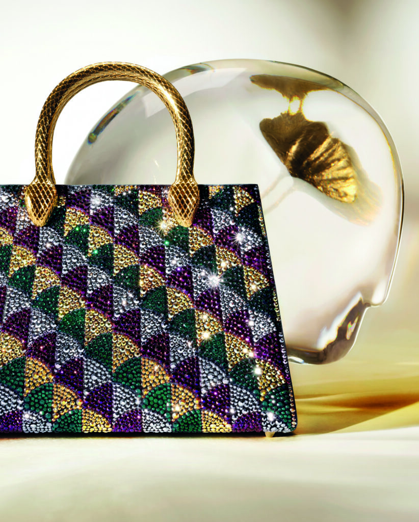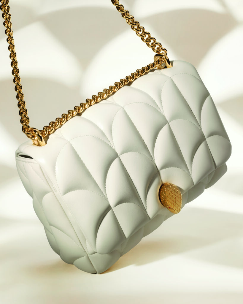 Décoré de somptueuses mosaïques, dont la principale, un éventail majestueux restauré par le mécénat de Bvlgari en 2015 et 2016 qui a inspiré la collection Diva’s Dream, le lieu éblouit de splendeur, avec ses innombrables couleurs et motifs. Cette forme de l’éventail rappelle aussi celle du lis calla, lequel Mary Katrantzou se plaît à réinterpréter à travers des traitements complexes de matelassés et de cristal pavé sur les silhouettes iconiques Serpenti Forever et sur le nouveau sac à bandoulière en nappa Serpenti Sugarloaf. Cette nouvelle collection dévoile également un sac à main trapèze, le Serpentine Duo, dont la forme évoque les différentes facettes d’une pierre précieuse. De même qu’avec la pochette Gingko et la pochette Calla, ou encore avec le sac Marquise, les univers de la joaillerie et de la maroquinerie s’associent dans cette poésie délicate et audacieusement singulière, à porter du matin au soir.