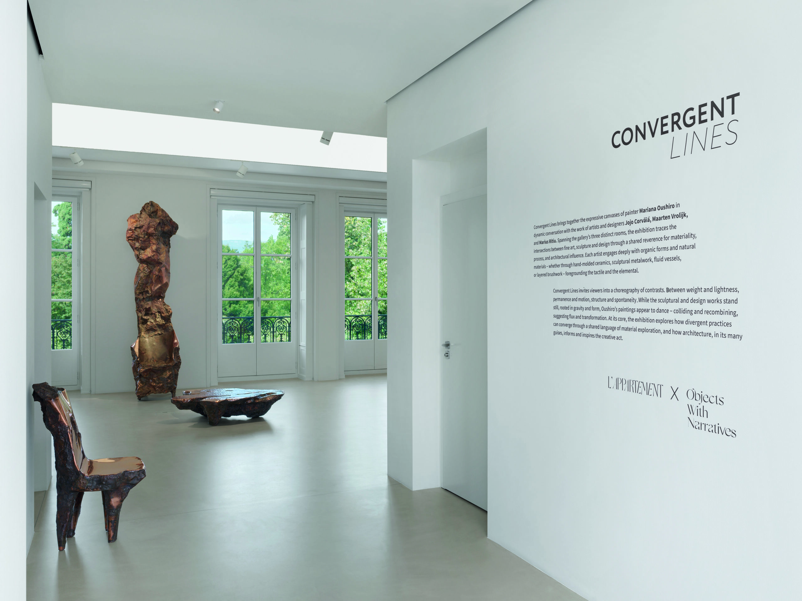 Avec sa dernière exposition intitulée Convergent Lines, L’Appartement table sur la multidisciplinarité. Avec une sélection d’œuvres issues de l’art, de la sculpture et du de- sign, elle questionne la matérialité et le processus créatif. Les grands formats peints au rythme du corps par Maria- na Oushiro, le mobilier et des sculptures monumentales de Marius Ritiu, les céramiques de Jojo Corväiá ou encore les luminaires et vases de Maarten Vrolijk, forment un dialogue de l’éclectique dans lequel s’engage une réflexion plus pro- fonde, celle de notre appréhension de l’organique et des éléments naturels. Niché au deuxième étage d’un bâtiment historique en plein cœur de Genève, L’Appartement pro- pose une nouvelle fois une sélection pleine de textures et de lumière, qui invite à la contemplation et à l’ouverture de nos horizons.