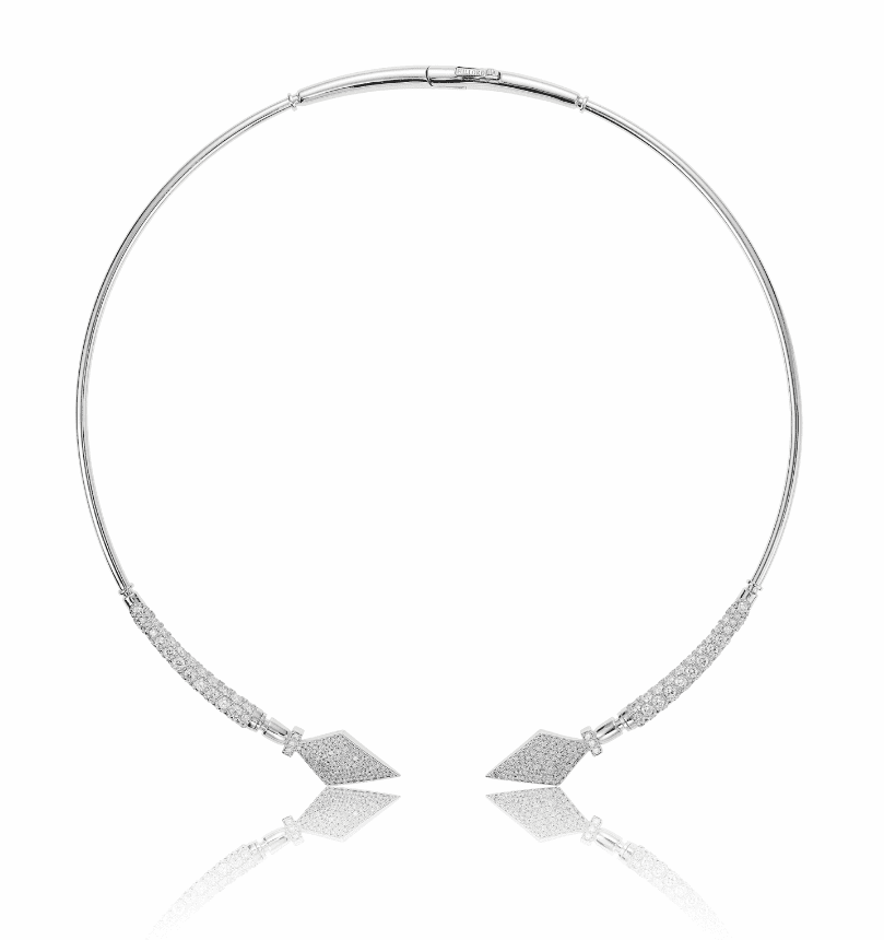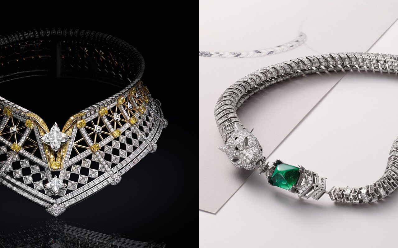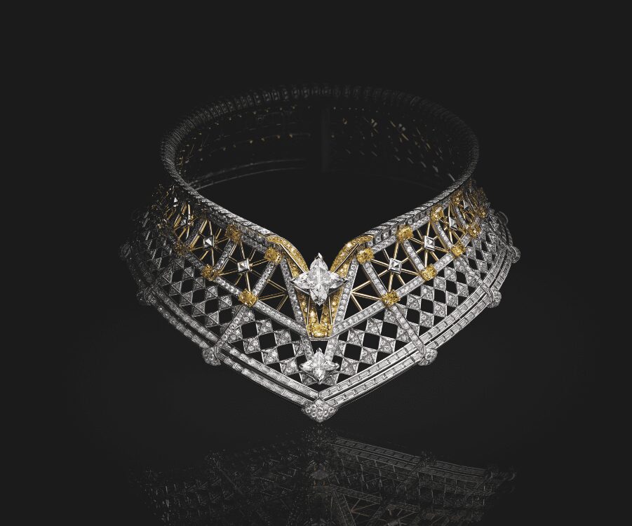 Imaginé par Francesca Amfitheatrof, le deuxième chapitre de Awakened Hands, Awakened Minds de Louis Vuitton ouvre une nouvelle page d’un voyage captivant à travers la France du XIXe siècle. Point culminant de cette collection, le thème Victoire célèbre la tour Eiffel à travers une pièce d’exception: un collier au design architectural, qui a nécessité près de 3923 heures de travail. Son maillage géométrique, structuré autour d’un V emblématique, sublime deux diamants taille LV Monogram Star, magnifiés par 25 diamants jaunes.