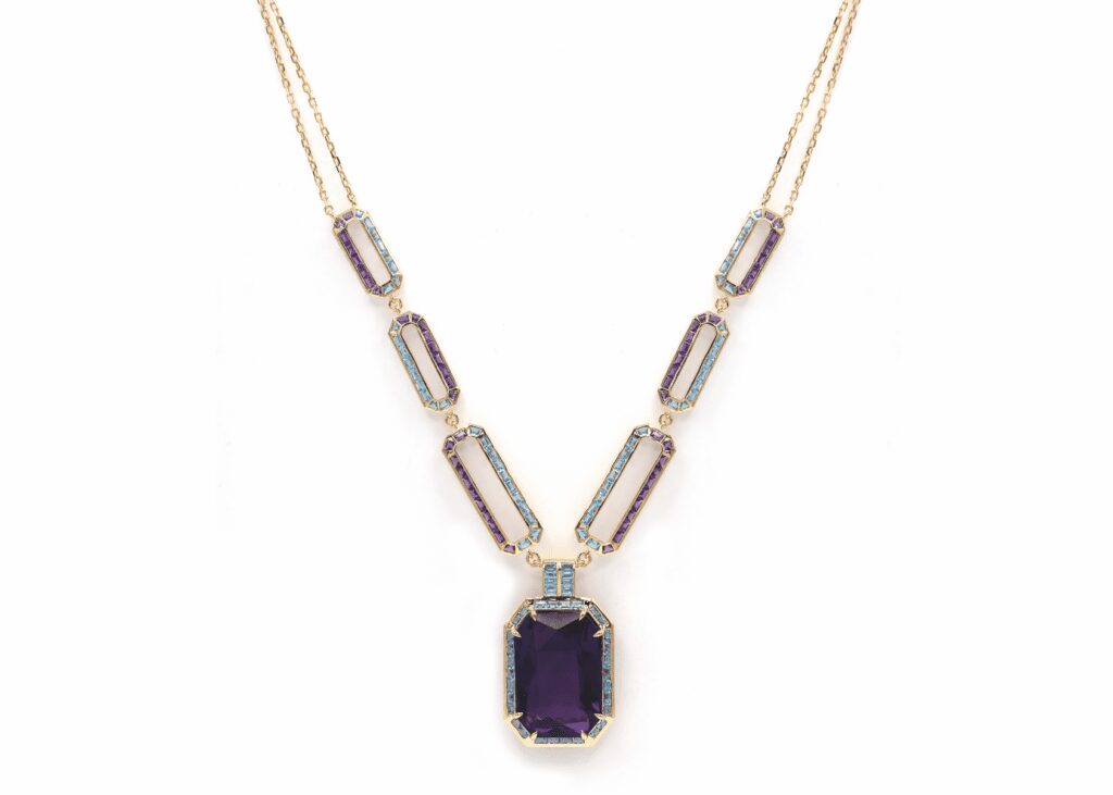 Inspiré par l’élégance et le charme intemporels du mouvement Art Déco, ce collier cocktail offre un contraste éblouissant entre améthystes et topazes bleues. Avec ses lignes géométriques qui rappellent l’architecture des gratte-ciels emblématiques new-yorkais, tel le Chrysler ou l’Empire State, cette pièce d’exception capture l’essence-même d’une époque marquée par le glamour hollywoodien et l’essor de la musique jazz.