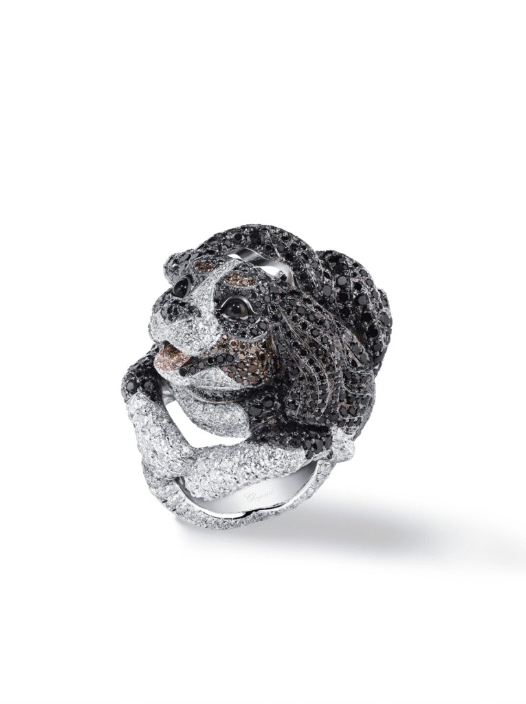 Entourée de nature, de fleurs et d’animaux dans son quotidien, Caroline Scheufele consacre dans ce nouvel opus une bague en diamants blancs, noirs et cognac à son Cavalier King Charles Byron, ainsi qu’une broche exquise en or éthique rose sertie de rubis aux roses de son jardin sur les bords du Léman. Comme un clin d’œil à sa passion pour la mode, citons encore ce majestueux choker orné d’une tourmaline rose-violet, dont le ruban dentelé est fait de diamants, de saphirs roses et d’améthystes.