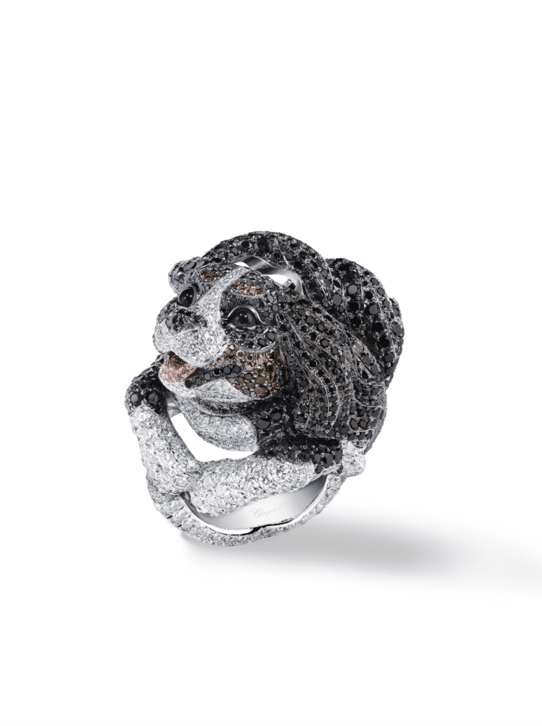 Caroline’s Universe ‘Byron’ the Cavalier King Charles ring: 18 K ethical yellow, white and rose gold, white, black, cognac and pink diamonds (12.65 cts), pink sapphires and onyx cabochons