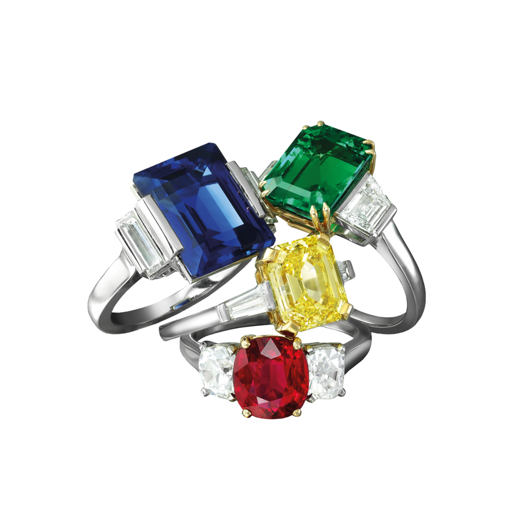A selection of rings set with exceptional gemstones and coloured diamonds