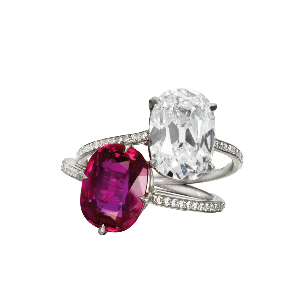 Platinum and diamond rings set with an old mine Burmese ruby & an old mine cushion shaped diamond both weighing 3 carats