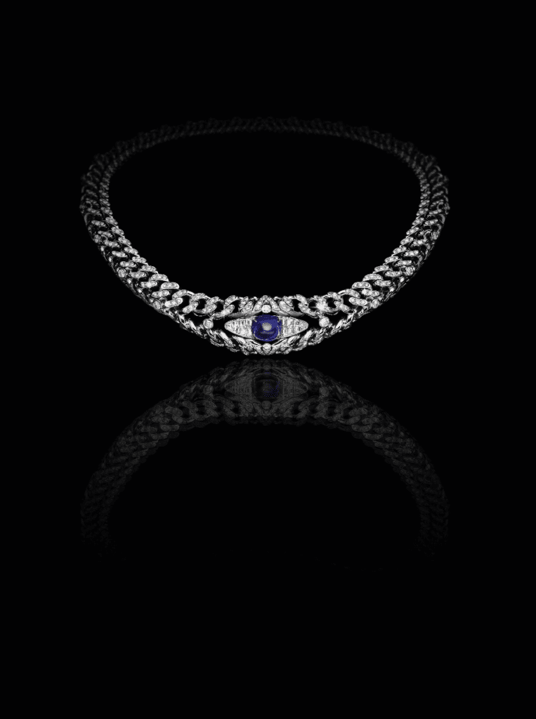 Deux actes, 12 thèmes et 110 pièces uniques… Louis Vuitton célèbre la virtuosité de l’exceptionnel, avec cette collection audacieuse. Comme un clin d’œil au parcours du jeune Louis Vuitton et l’esprit de la Maison fondé sur l’apprentissage indispensable à l’explosion créative, Louis Vuitton Virtuosity célèbre les savoir-faire joailliers et la connaissance. Intégrant bien sûr les emblématiques Monogram et Damier, la collection explore aussi de nouveaux motifs tel que l’œil omniscient. Réalisé à la manière d’une maille d’or et de diamants, le collier Keeper accueille en son centre un saphir bleu du Sri Lanka taille cabochon de 10.12 carats. Un bracelet, trois bagues, quatre broches et deux montres complètent cette parure qui porte chance.