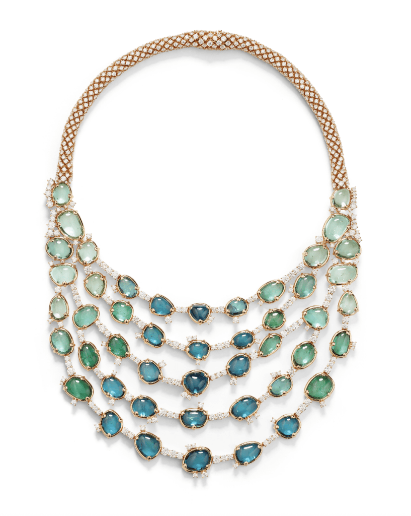 Dérivé du grec poly qui signifie «multitude», et de chromia qui veut dire «couleurs», Polychroma n’est pas qu’un simple titre. C’est l’évocation d’un monde où la couleur devient langage, celui de la Città Eterna. Dans ce kaléidoscope précieux imaginé par la directrice de la création Lucia Silvestri, le collier Polychromatic Bloom est un vrai chef d’œuvre. Composé de plus de 500 éléments, il combine des couleurs audacieuses avec trois pierres d’exception: une rubellite centrale de 106,36 carats, un péridot de 55,52 carats ainsi qu’une tanzanite de 55,11 carats. Avec 250 nouvelles créations, la collection Polychroma explore les autres univers de la maison Bvlgari, avec d’extraordinaires montres et des sacs joailliers, des lunettes de soleil ou encore des parfums ultra exclusifs.