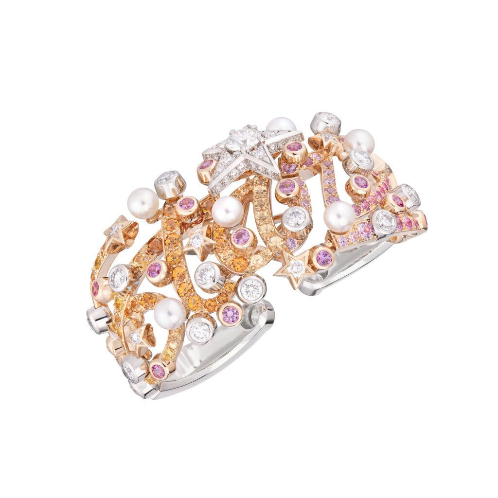 Aim for the Stars ring: Platinum, pink gold, one brilliant-cut diamond (0.31 ct), naturalpolished diamonds, yellow sapphires, pink sapphires,spessartite garnets and Akoya pearls