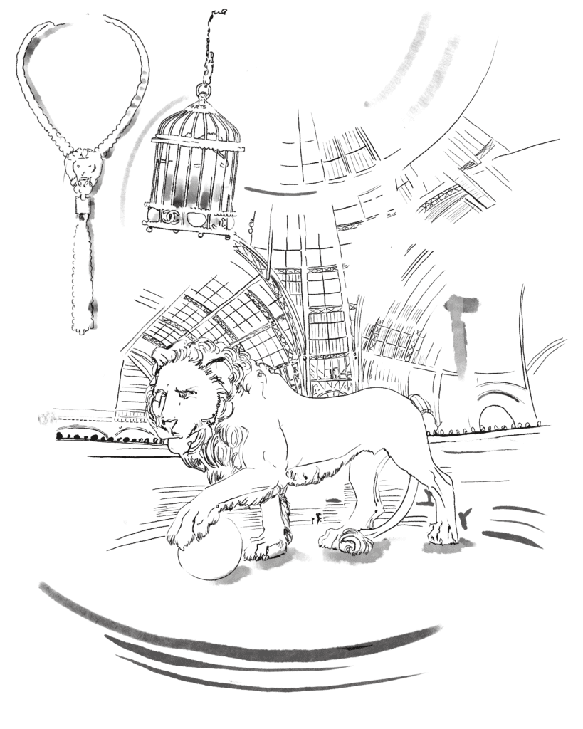 Née sous le signe du Lion, elle s’identifie à l’animal, y voyant le reflet de sa propre force intérieure. Un séjour à Venise va renforcer cette fasci- nation dans les années 1920 : elle tombe sous le charme de la basilique Saint-Marc. Sur sa façade : le lion ailé, symbole de la cité et puissance protectrice. Le lion de la Sérénissime a transformé un marais en empire, dominé les mers, ouvert des comptoirs ; il fut la banque du monde et posséda une des flottes les plus redoutables de l’Histoire. Royal, mys- tique, il est intégré à l’univers créatif de la Maison, se fraie un chemin dans les collections, apparaît sous forme de broches, de boutons, de fer- moirs ou encore de sculptures miniatures. Le lion symbolise la femme CHANEL, forte, indépendante, majestueuse. Il incarne l’esprit d’une maison qui ne se laisse pas dominer, qui règne sur le monde du luxe.