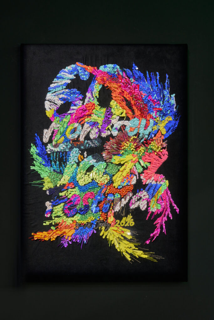 Le parcours se conclut par plusieurs collaborations emblématiques. Avec Caran d’ Ache, stylos et crayons usagés deviennent perles multicolores pour une robe Haute Couture spectaculaire. Avec la Cinémathèque suisse, une saison dédiée à la mode et au textile voit le jour. Et pour la 60e édition du Montreux Jazz Festival, l’artiste signe une affiche composée de 60 000 perles et matériaux upcyclés, une première pour le festival.