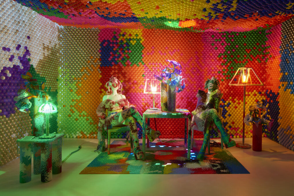 Au centre de l’espace, une chimère textile monumentale réunit perles excédentaires, paillettes délaissées, fibres recyclées et fragments collectés. Cette sculpture tactile condense l’ADN de la maison et révèle la richesse des ressources transformées, ainsi que leur potentiel poétique.