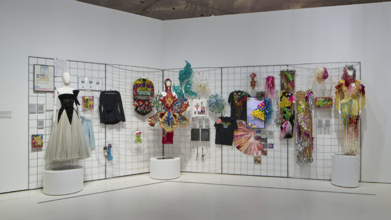 Le parcours se conclut par plusieurs collaborations emblématiques. Avec Caran d’ Ache, stylos et crayons usagés deviennent perles multicolores pour une robe Haute Couture spectaculaire. Avec la Cinémathèque suisse, une saison dédiée à la mode et au textile voit le jour. Et pour la 60e édition du Montreux Jazz Festival, l’artiste signe une affiche composée de 60 000 perles et matériaux upcyclés, une première pour le festival.