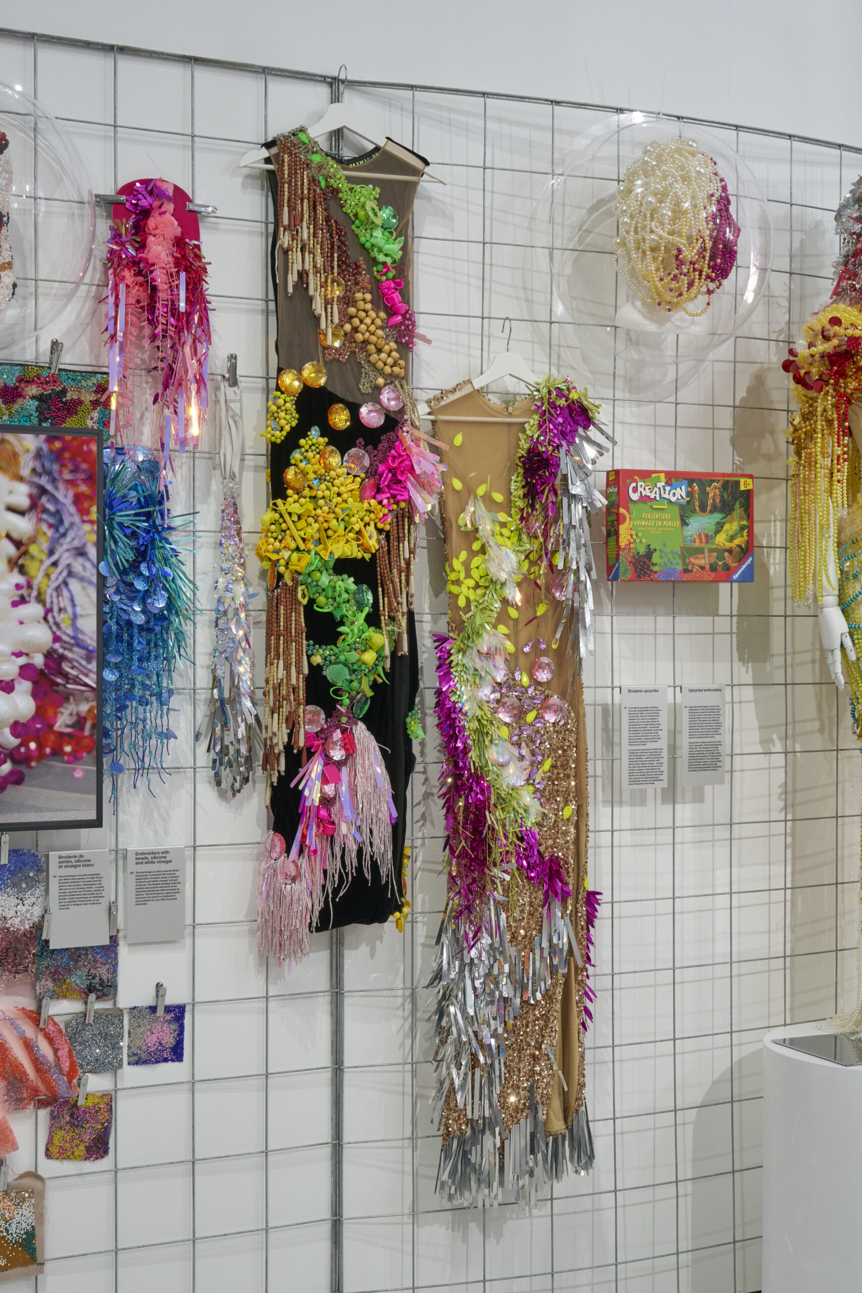 Au centre de l’espace, une chimère textile monumentale réunit perles excédentaires, paillettes délaissées, fibres recyclées et fragments collectés. Cette sculpture tactile condense l’ADN de la maison et révèle la richesse des ressources transformées, ainsi que leur potentiel poétique.