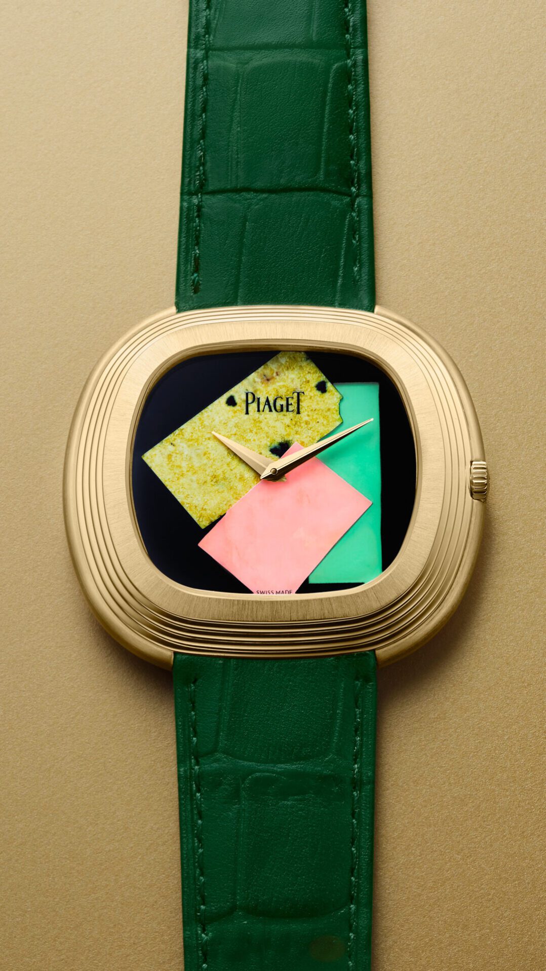 En 2024, Piaget s’associait à la Fondation Andy Warhol for the Visual Arts et renommait la version contemporaine de son garde-temps « Montre Andy Warhol ». Aujourd’hui, la Maison et la fondation lancent une édition capsule limitée à 50 pièces, hommage à la créativité de l’artiste. S’inspirant du célèbre auto-portrait-collage Polaroïd de 1986, ce garde-temps coloré se distingue par un cadran en marqueterie de pierres ornementales telles que l’onyx noir, la serpentine jaune, l’opale rose et la chrysoprase verte. À l’intérieur d’un boîtier à gradins de 45 mm en or jaune 18 carats, le mouvement Manufacture à remontage automatique 501P1 extra-plat offre 40 heures de réserve de marche. Le tout est monté sur un bracelet en cuir vert. Au verso, la montre figure une gravure de l’autoportrait d’Andy Warhol, le logo Piaget ainsi que la signature de l’artiste.