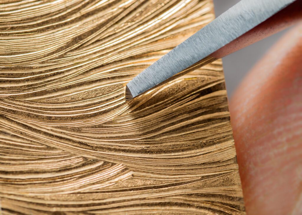 Entre les mains expertes des artisans orfèvres de Piaget, l’or se mue en une multitude de formes et d’aspects. Modelé, sculpté, gravé, tissé, poncé, brossé, poli et articulé, le métal est en perpétuelle métamorphose. Parmi les techniques signature, le Décor Palace s’inspire du guilloché. Développé en 1961, ce procédé rompt la longue tradition des surfaces lisses et polies. L’or n’est ainsi plus un figurant structurel mais bien personnage principal des créations, devenant un élément décoratif à part entière. Requérant une grande minutie et dépendant du geste particulier de chaque artisan, le Décor Palace sublime la matière de ses rainures de différentes épaisseurs, créant un effet de mouvement subtile sur la matière. Un style de gravure unique, qui permet de représenter tantôt une écorce d’arbre, des écailles de serpent, ou encore la surface scintillante d’un lac suisse.