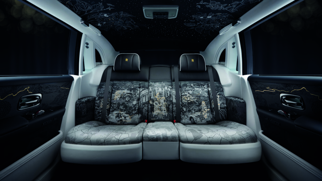 Le travail du bois atteint ici un niveau inédit : marqueterie 3D, superposition d’encres et dorure à l’or 24 carats composent des panneaux sculpturaux retraçant les parcours marquants de la Phantom. Le Salon Anthology, véritable pièce maîtresse de l’habitacle, s’apparente à un livre ouvert, où citations et références historiques se dévoilent à travers un jeu subtil de lumière, révélant de nouveaux détails selon l’angle de vue.