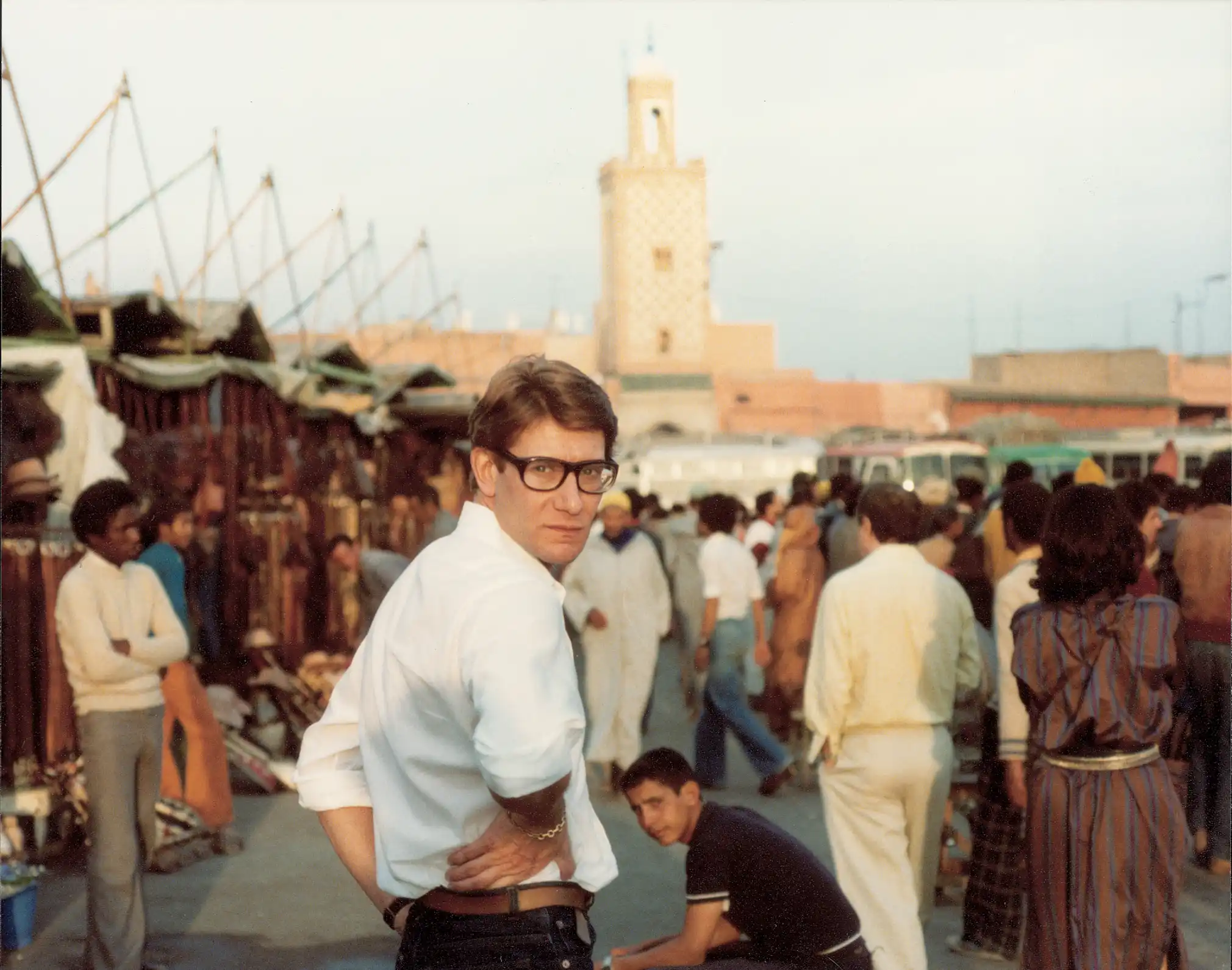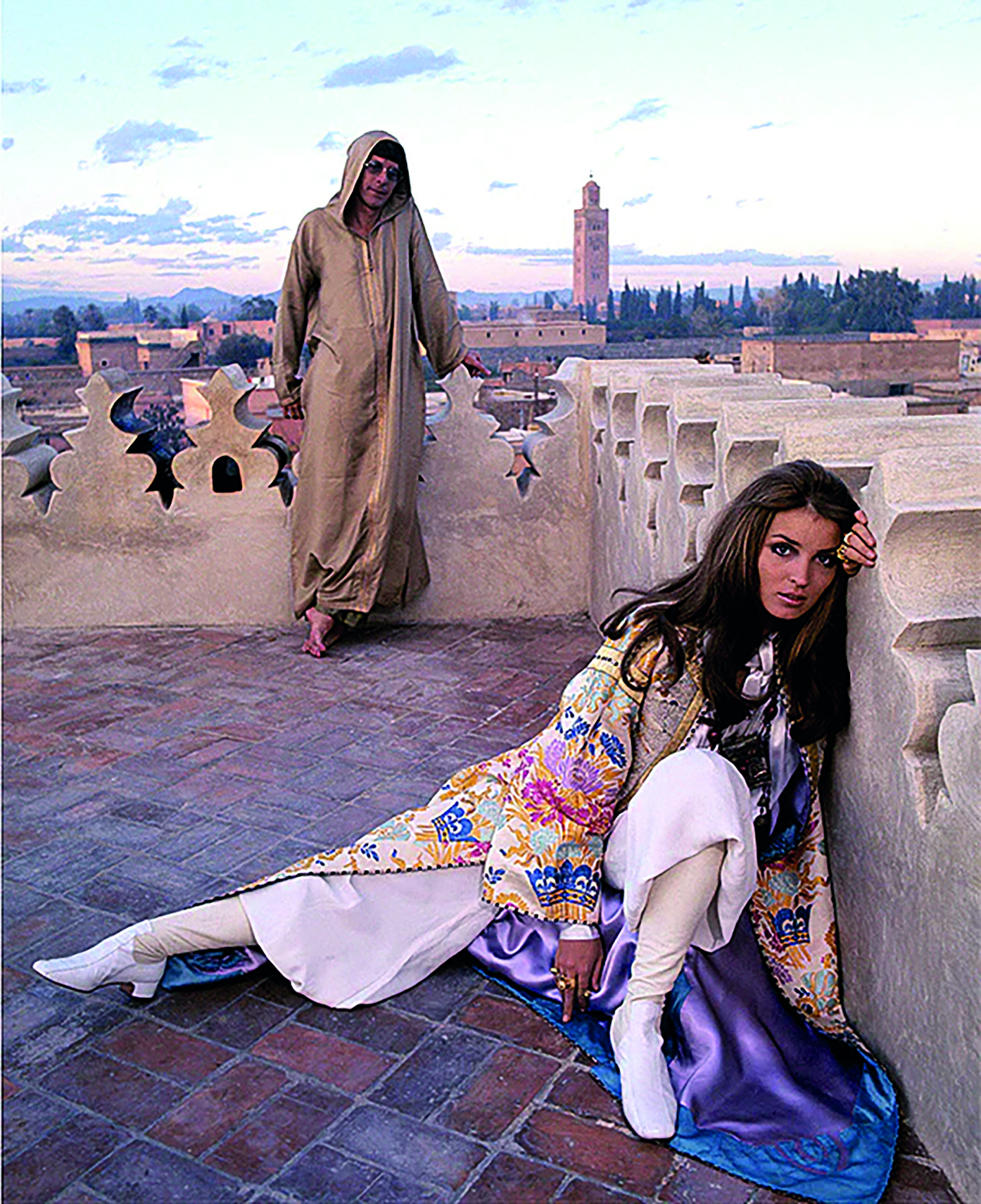 Marrakech attire une autre forme de jet-set. Paul Bowles avait déjà donné à la ville une aura littéraire, mais c’est dans les années 1960 que la médina devient refuge d’artistes et de couturiers. Ta- litha Getty immortalise la ville dans une photo devenue culte sur une terrasse de la médina. Yves Saint Laurent et Pierre Bergé y acquièrent le Jardin Majorelle, transformant Marrakech en capi- tale du raffinement oriental.