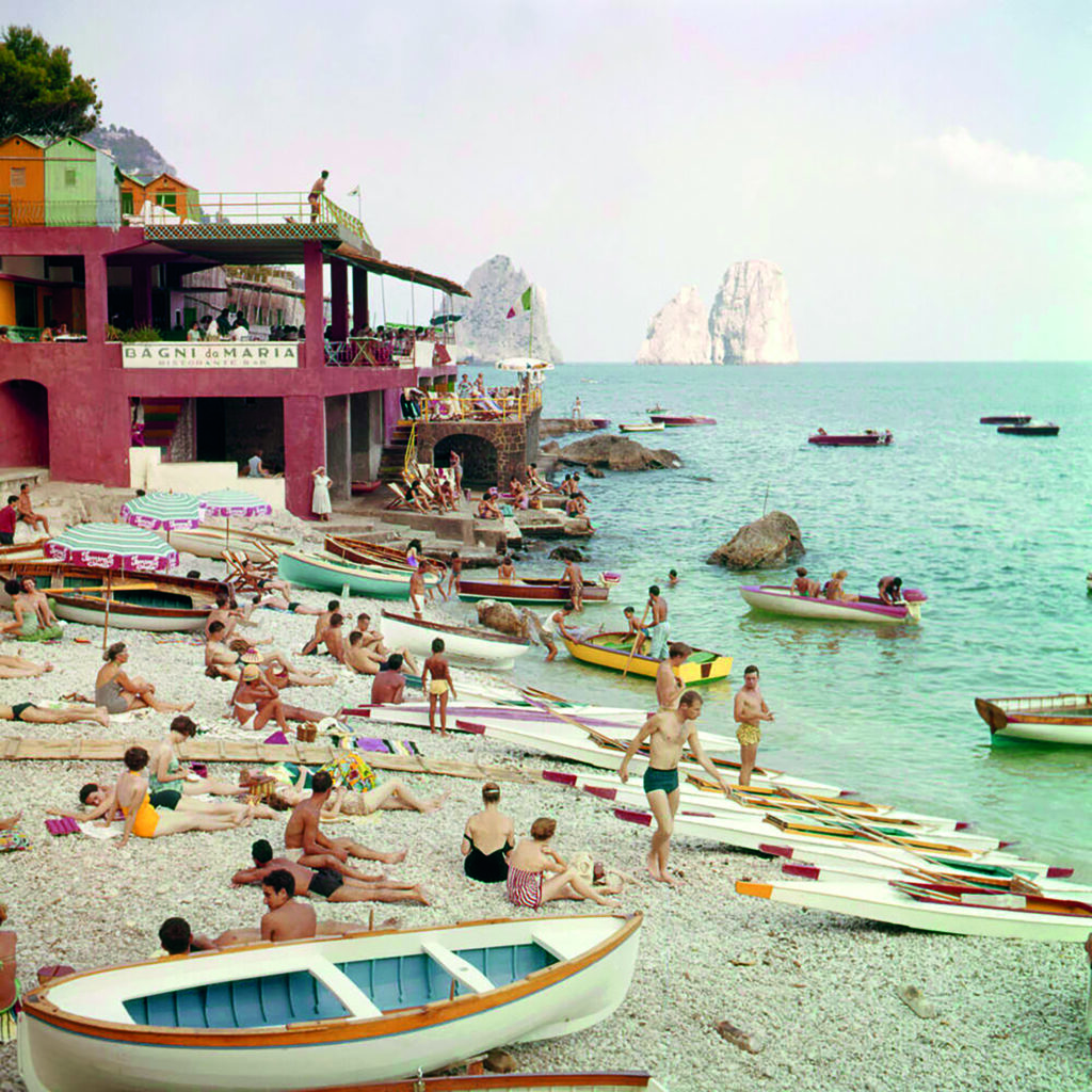 À Capri, la dolce vita s’écrit entre escaliers abrupts et terrasses surplombant la Méditerranée. Les stars hollywoodiennes croisent Aristote Onassis et Maria Callas au mythique Quisisana, tandis que la Piazzetta devient le théâtre d’une élégance décontractée. Jackie Kennedy et Grace Kelly y popularisent un style chic et solaire, tan- dis que les artisans locaux inspirent les créateurs italiens.