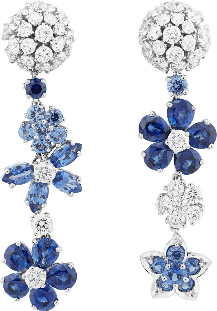 Des tons jaunes et orangés joyeux de la citrine, aux splendeurs du bleu clair et profond de l’aigue-marine en passant par l’améthyste et ses tonalités violettes, le rose profond de la rhodonite ou le vert clair du péridot, les pétales contrastent avec des pistils de diamant et dialoguent avec l’éclat de l’or rose, jaune ou blanc, sublimant leur couleur.