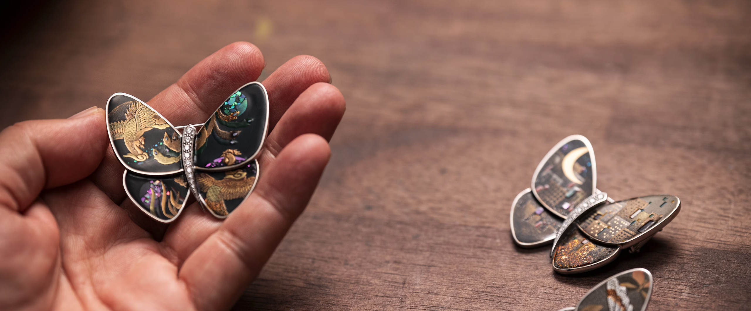 Dans son atelier, situé à Wajima, dans la préfecture d‘Ishikawa, Monsieur Hakose associe l‘artisanat traditionnel de la région, le Wajima-nuri, et sa propre vision de l‘art de la laque. Et c’est ainsi que se poursuit depuis vingt ans un dialogue artisanal et interculturel d’une richesse éblouissante. Conçu en France à partir d’or jaune et blanc, de nacre et de diamants, chaque papillon de Van Cleef & Arpels est ensuite méticuleusement décoré à la main par le maître selon la technique du maki-e (saupoudrage de poudre d’or ou d’argent) ou du raden (incrustation de nacre).